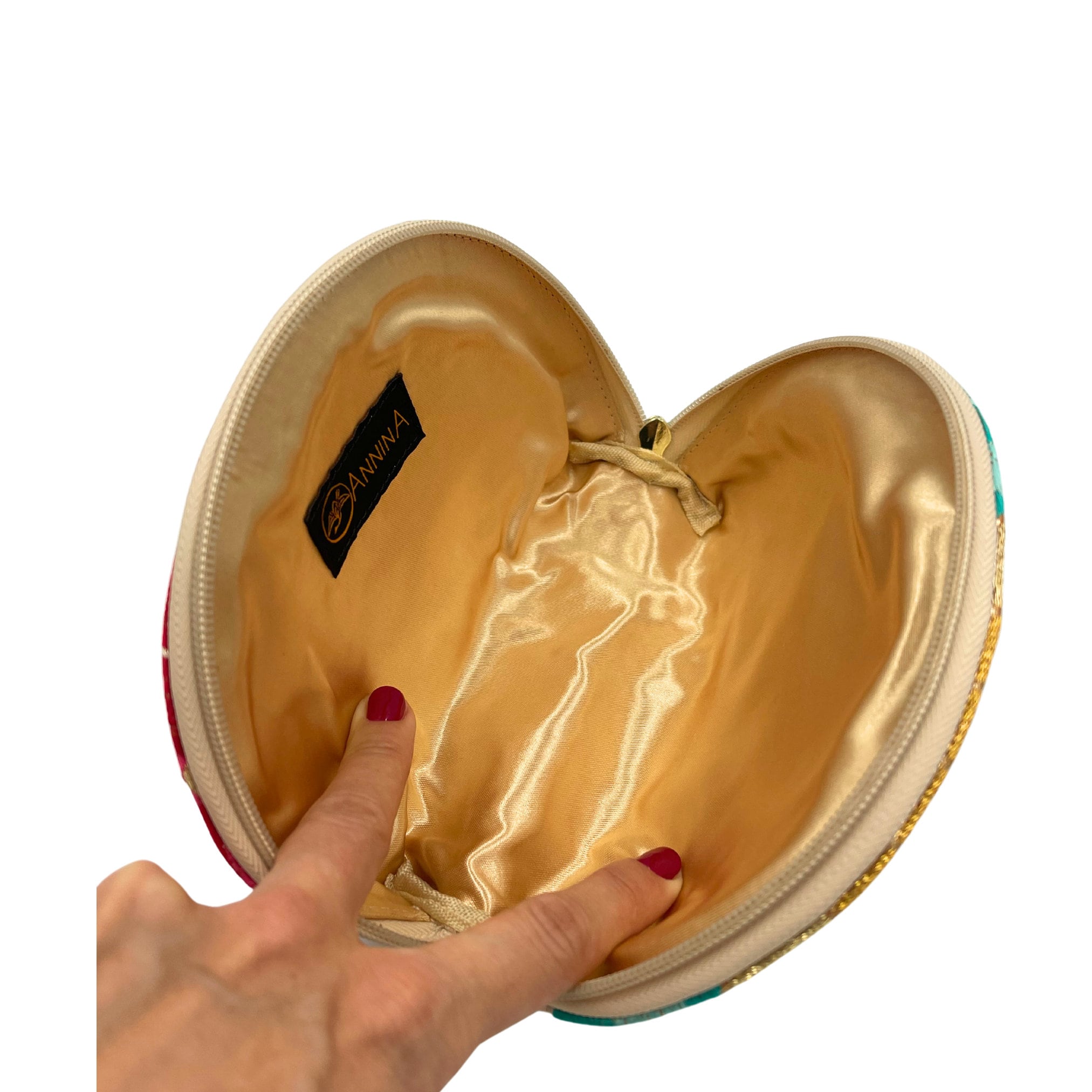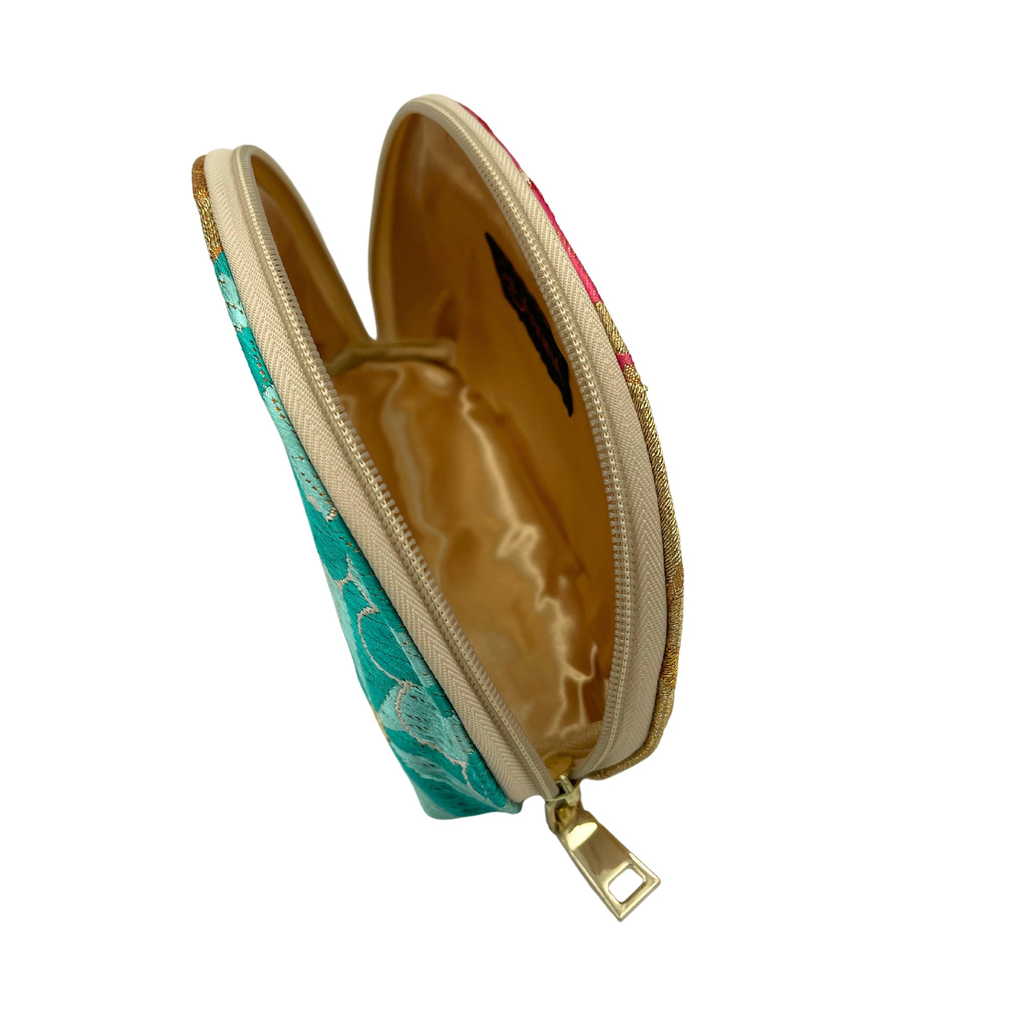 Handcrafted with attention to detail, this pouch is not just a practical accessory but also a piece of art. The vibrant gold, pink, and turquoise hues are sure to make a statement wherever you go.